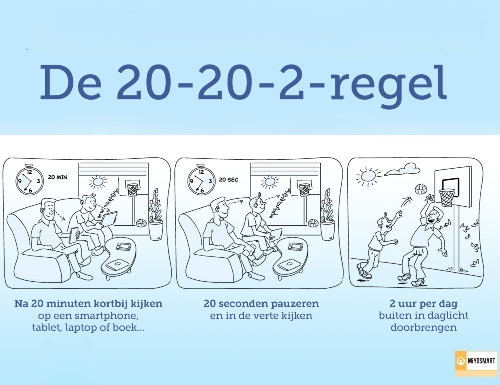 - Schermpauzes elke 20 minuten: 20 seconden ver weg kijken