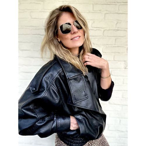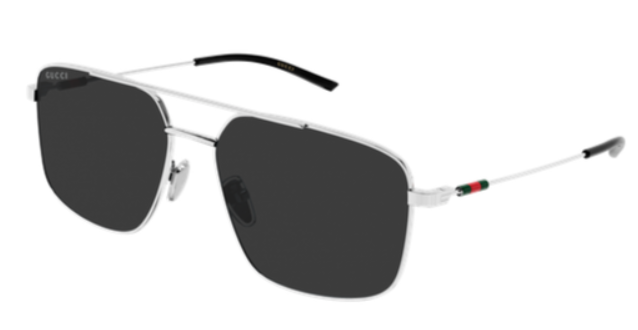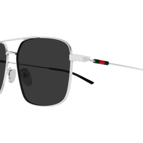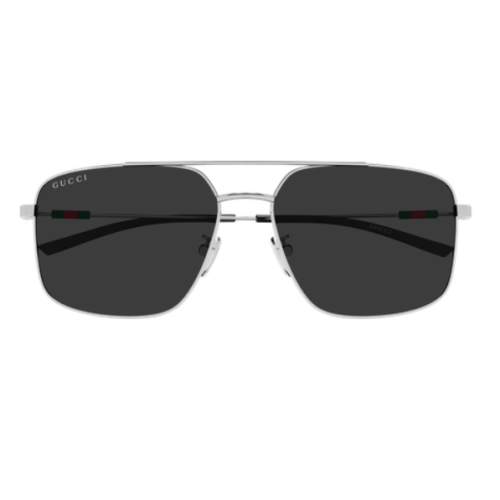 Classic yet recognizable silver or gold galvanic with temples embellished by a plastic web detail insert. Oversized squared shape with double bridge detail. Green red green web detail.