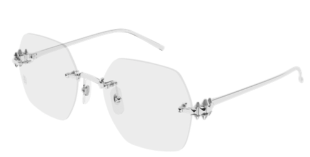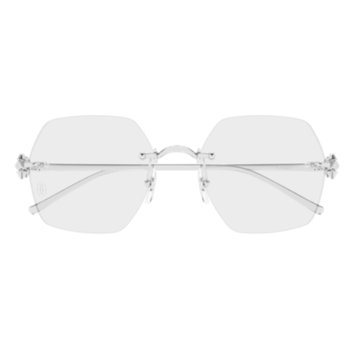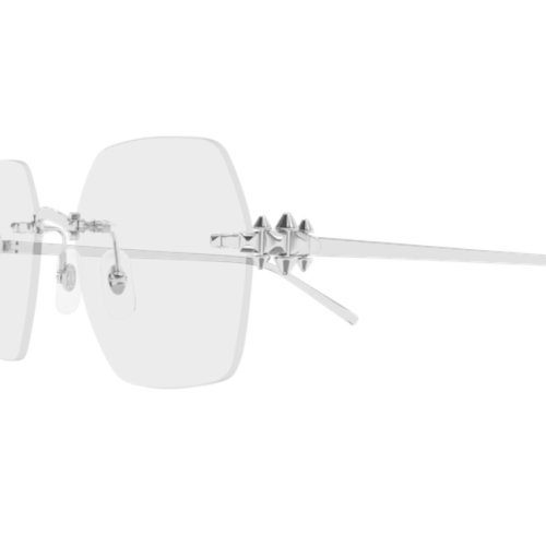 New Clash de Cartier evolution characterized by a lighter icon detail on the metal hinge. Feminine classic geometric rimless shape for an iconic and elegant look. The three Picots of different dimensions are perfectly intertwined and able to move slightly, faithfully reproducing the jewelry collection. Precious finish in gold or platinum and Cartier logo on the metal temple tips.