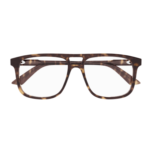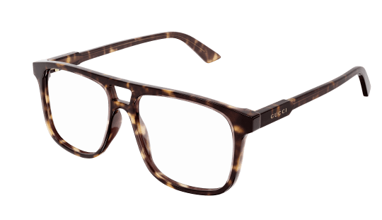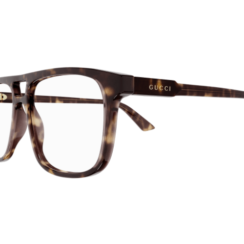 Additional shapes into the light acetate concept for a casual yet sophisticated look. Sporty double-bridge squared shape. Gucci Lettering logo on temples. The style is available in classic dark colors or distinctive contrasting havana / trasparent beige option.