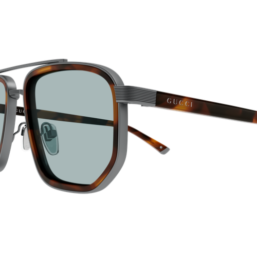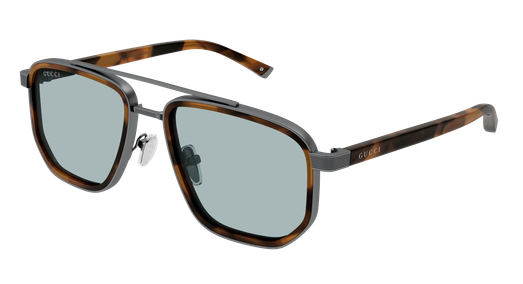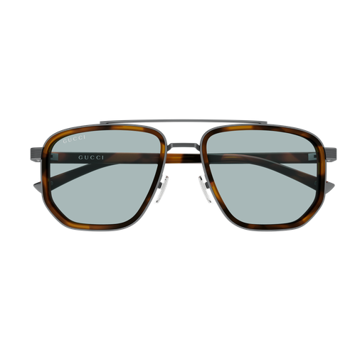 Combi styles characterized by the gucci institutional logo, a visible wirecore running through the temples, and a metal endtip detail. Geometric pilot shape. Cool color palette featuting both dark-toned colors and havanas.