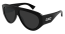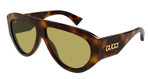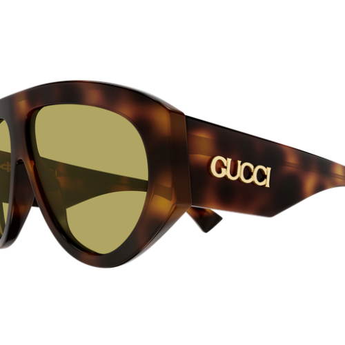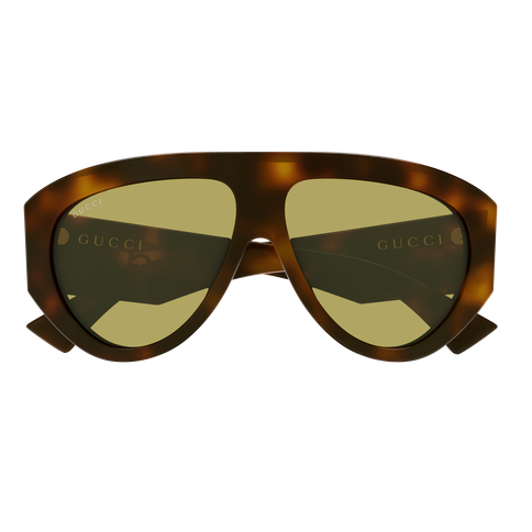 Bold acetate version of a carry over concept featuring a pantostopic angle and the institutional logo on the temples. Pilot mask shape. Fashion forward color palette featuring solid and transparent colors, as well as some skus with the G Monogram pattern.