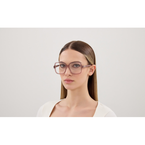 Squared oversized shape with thin acetate temple. Marcie logo at the center of the temple creating a game of movement between solid and empty forms.