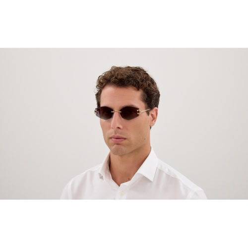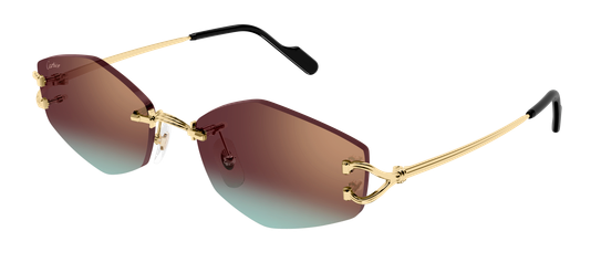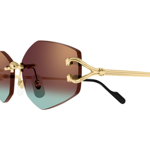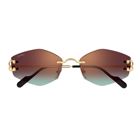 Revamped version of the iconic Décor C metal aesthetic, characterized by the Godron icon along the entire temple. Modern unisex polygonal shape in rimless construction for an authentic and stylish look. Iconic Décor C detail being a functional and aesthetical element of the metal hinge. Precious finish in gold or platinum paired with colorful lenses and acetate temple tips with Cartier logo tag to ensure comfort.