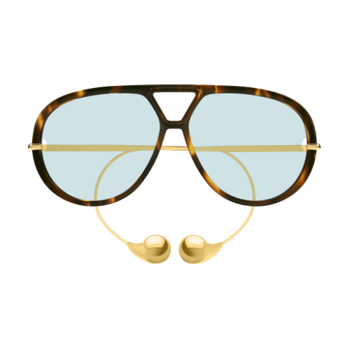 Combi style characterized by acetate oversize front feat. an hole in the lenses. Curled metal temple topped at the tip with a small Drop that mimics exactly the earing.