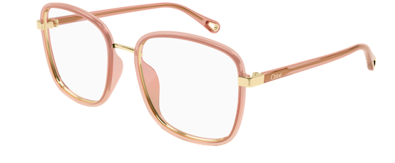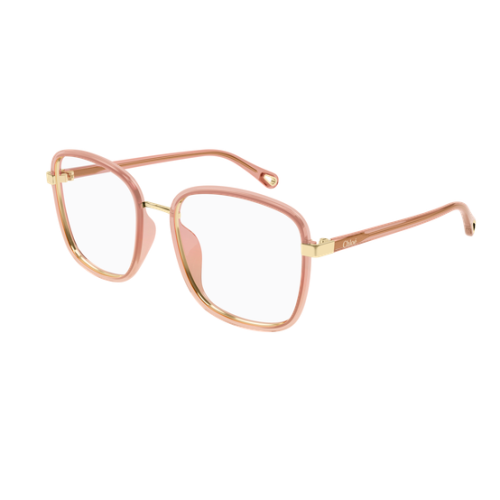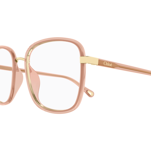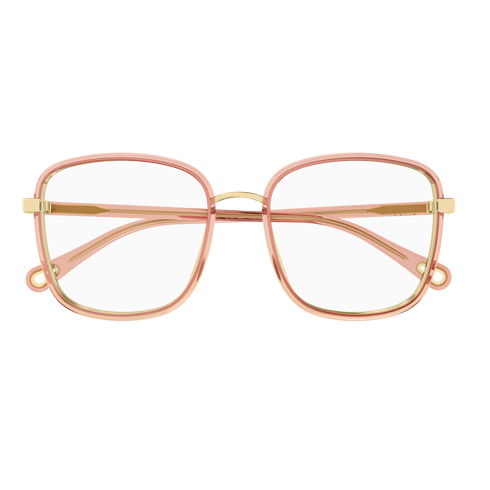 70's inspired square metal frame with injected rainbow coloured rims and gradient temples. Metal nose bridge and metal gold griffe that liaise the front rim to the temple which have an hot stamping logo on the left one. Iconic signature teardrop cutout serving as an aesthetic and functional way to attach the Chloé eyewear jewelry at the end of the temple tips, enriched with the logo engraved.