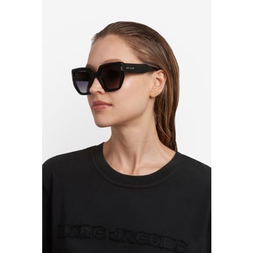 An elegant new take on the J Marc premium eyewear edit, these women's sunglasses express bold femininity via geometric lines and iconic details. Entirely crafted from acetate, they are elevated to statement status by the unmistakable engraved "JJ" motif on the front and glistening logo lettering along the arm. The style reveals a metal wirecore engraved with the Marc Jacobs monogram, visible inside the double-layer temples.